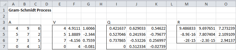 The orthonormal basis is given by the columns of matrix Q. That these columns are orthonormal is confirmed by checking that QTQ = I by using the array formula =MMULT(TRANSPOSE(I4:K7),I4:K7) and noticing that the result is the 3 × 3 identity matrix.