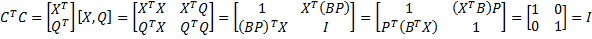 Now define the n+1 × n+1 matrix C whose first row is X and whose remaining rows are those of Q, i.e. C = [X, Q]. We now show that C is orthogonal. First we note that since X is a unit vector, XTX = X ∙ X = 1. Since the columns of B along with X are orthogonal, XTBj= X ∙ Bj = 0 for any column Bj in B, and so XTB = 0, as well as BTX = (XTB)T = 0. Finally since Q is orthogonal, QTQ = I.