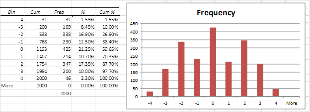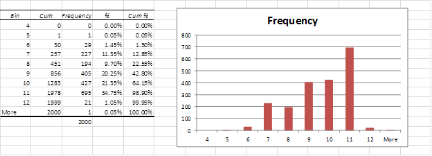 We now take the median of each of the 2,000 samples (only the first 21 samples are shown in Figure 1). E.g. cell X4 contains the formula =MEDIAN(D4:W4). Next we plot the distribution of the medians (i.e. range X4:X2003) in a histogram using Excel’s Histogram data analysis tool (or Excel’s charting capability), augmented with percentage and cumulative % columns. The results are shown in Figure 2.