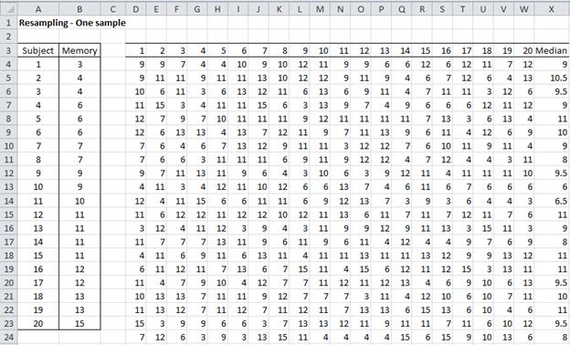 We treat the sample as the population and draw 2,000 samples of size 20 (the same size as the original sample) with replacement. Referring to Figure 1, range D4:W4 represents the first sample, D5:W5 the second, etc. Each element in each sample is selected using the following function: