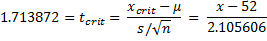 When xcrit = 55.60874, the t statistic for the t distribution with mean 53.16667 is