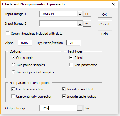 Enter A5:D14 in the Input Range and 78 for the Hypothetical Mean/Median, unclick Column headings included with data, choose the One sample and T test options and press OK. The output appears in Figure 5. The confidence interval and effect size output in Figure 5 will be described next.
