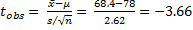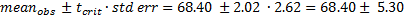 This yields a 95% confidence interval of (63.10, 73.70). Since the interval doesn’t contain the hypothetical mean of 78, once again we are justified in rejecting the null hypothesis.