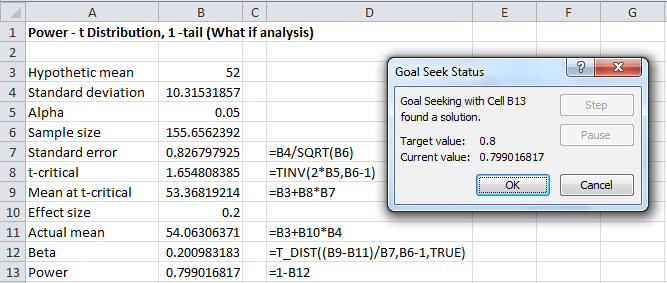 We are requesting that Excel find the value of cell B10 (the effect size) that produces a value of .8 for cell B13 (the power). Here the first entry must point to a cell which contains a formula. The second entry must be a value and the third entry must point to a cell which contains a value (possibly blank) and not a formula. After clicking on the OK button, a Goal Seek Status dialog box appears and the worksheet from Figure 9 changes to that in Figure 11.
