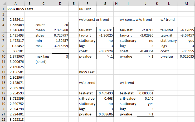 KPSSTEST(R1, lab, lags, type, alpha) – an array function which returns a column range for the KPSS test consisting of test-stat, crit-value, stationary (yes/no), lags and p-value.