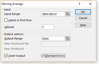 To use this tool for Example 1, select Data > Analysis|Data Analysis and choose Moving Average from the menu that appears. Fill in the dialog box that appears as shown in Figure 2.