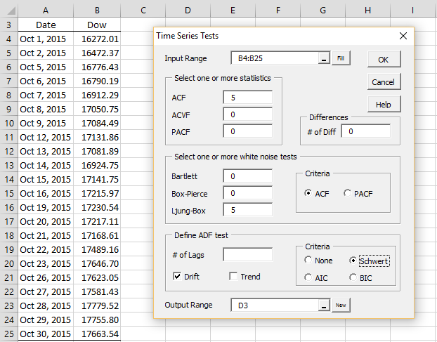 To use this tool for the data in Example 1 of Stationary Process (repeated in Figure 1), press Ctr-m and choose the Time Series option. Select the Testing option on the dialog box that appears and click on the OK button. Now, fill in the dialog box that appears as shown in Figure 1.