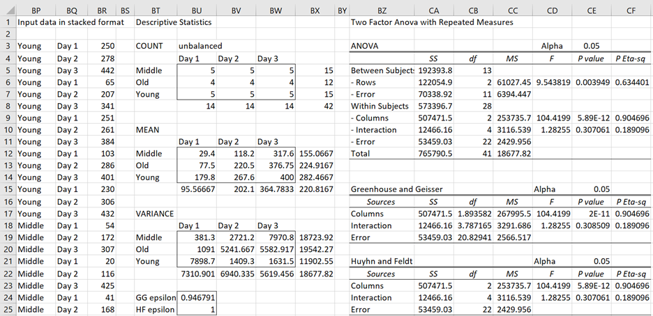 The input data is converted to standard (stacked) format (range BP3:BR44, only the first 23 rows are displayed). Note too that the output shown in range BZ3:CF12 is identical to that shown in Figure 3 of Mixed Repeated Measures ANOVA using Regression. The GG epsilon and HF epsilon values shown in BU24 and BU25 are calculated by the formulas =GG_Epsilon(A3:D17) and =HF_Epsilon(A3:D17).