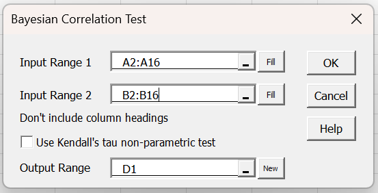 To use this tool for Example 1, press Ctrl-m and select the Bayesian Correlation Test option from the Bayes tab. Fill in the dialog box that appears as shown in Figure 2.