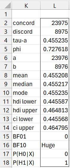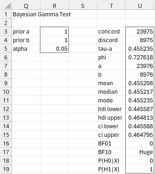 Since BF10 is huge, we see that there is overwhelming support for the alternative hypothesis that gamma > 0 (gamma is equal to tau-a).