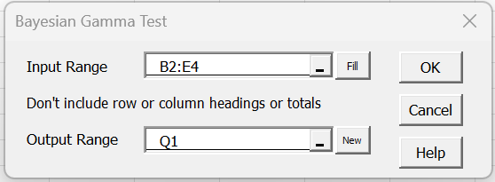 To use this tool for Example 1, press Ctrl-m and select the Bayesian Gamma Test option from the Bayes tab. Fill in the dialog box that appears as shown in Figure 3.