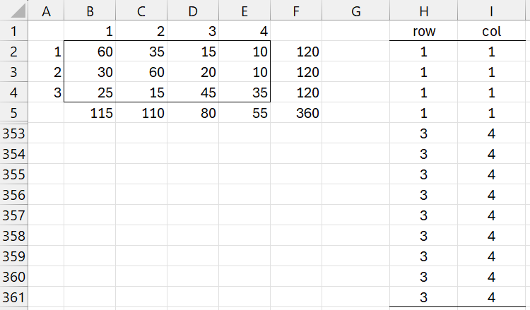 You can obtain the results shown in range H2:I361 by using the array formula =TABLE2RAW(A1:E4) or alternatively the array formula =TABLE2RAW(B2:E4, TRUE). You could also obtain the contingency form of the table by using the formula =RAW2TABLE(H2:I361).