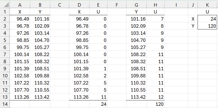 The first thing we do is calculate UX and UY. We see that UX = 24 (cell E14), as calculated by the formula =SUM(E2:E13). The values in column E are determined by inserting the formula =COUNTIF(B$2:B$13,”<“&A2) in cell E2, highlighting E2:E13, and pressing Ctrl-D. UY in cell H14 is calculated in the same way by reversing the roles of X and Y. Since there are no ties UX + UY = mn where m and n are the sizes of the two samples.