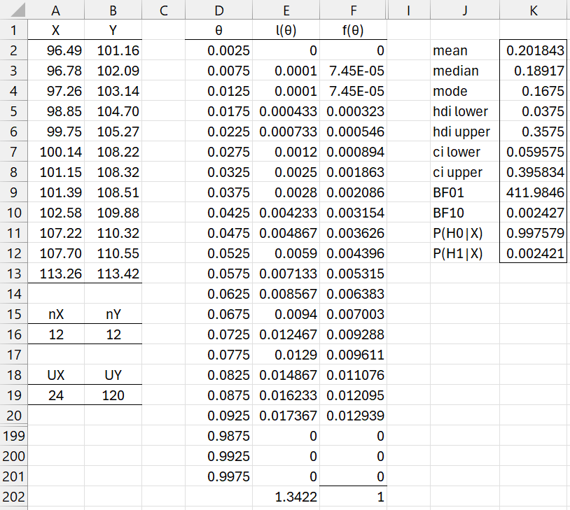 You can produce the values in range F2:F201 of Figure 2 by the formula =BayesMWX(A2:A13, B2:B13) or =BayesMW1X(A16, B16, A19). The values in range J2:K12 of that figure can be produced by the formula =BayesMW1Sm(A16, B16, A19, TRUE). The formula =BayesMWX(A2:A13, B2:B13, TRUE) would produce the same output preceded by the nX, nY, UX, UY values of 12, 12, 24, and 120.