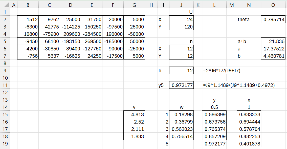 The L, v, and w values are constants as well as the values in cells L14 and N14. Cell L19 contains the formula =J11. Cell L15 contains the formula =J$11*J15+0.5*(1-J15), cell N15 contains the formula =MAX(J2:J3)/SUM(J2:J3), and cell N16 contains =N$15*N15. The remaining cells are filled in by highlighting L15:L18 and pressing Ctrl-D and highlighting N16:N19 and pressing Ctrl-D.