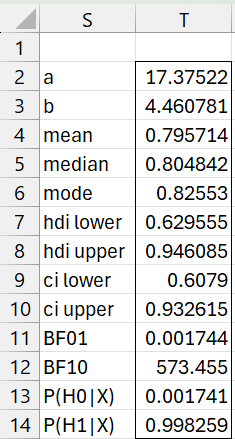BayesMW1Lg(n1, n2, u1, u2, lab, a, b, alpha): returns an array with the posterior Beta parameters, mean, median, mode, 1-alpha HDI lower/upper, 1-alpha equal-tailed CI lower/upper, and hypothesis test BF01, BF10, P(H0|X,Y) and P(H1|X,Y) for a Bayesian Mann-Whitney test based on the null hypothesis θ1 < .5. The output is based on a Beta distribution approximation using a Beta prior with parameters a (default 1) and b (default 1).