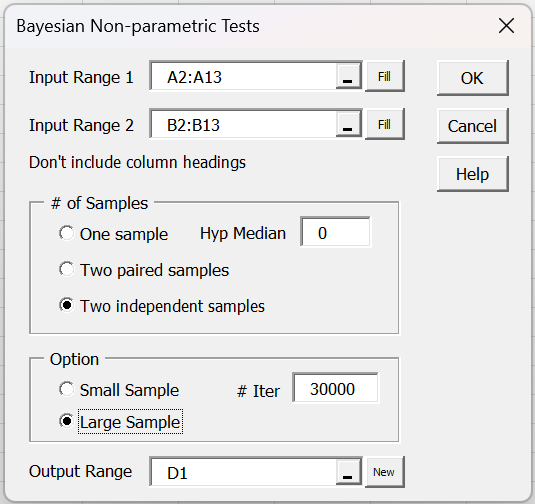 The values in cells K2 and K3 of Figure 1 can be produced using the formulas =BayesMWU(A2:A13, B2:B13) and =BayesMWU(B2:B13, A2:A13).