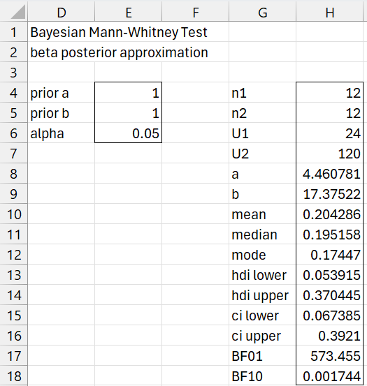 You can use the formula =BayesMW1Lg(12, 12, 24, 120, TRUE) to produce the output in Figure 4.