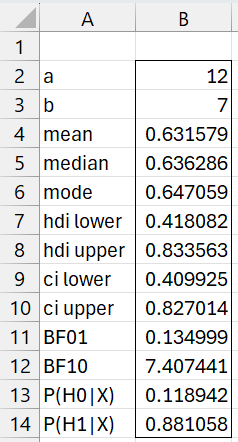 The posterior beta distribution has parameters a = 11+1 = 12 and b = 6+1 = 7. The result of the analysis is shown in Figure 1 using the array formula =BayesBeta(12,7,TRUE).