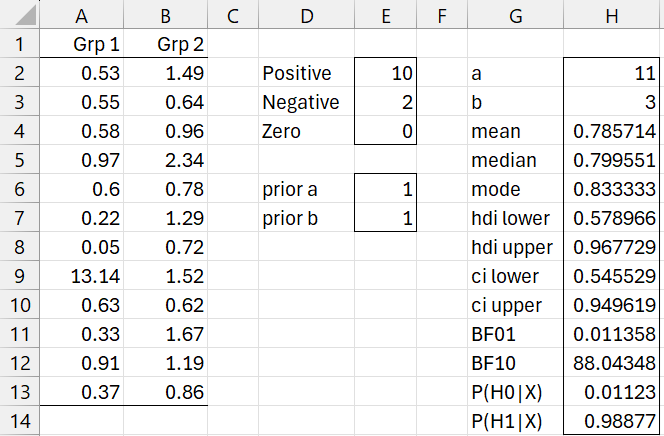 =BayesSign(A2:A13,B2:B13,TRUE,E6,E7).