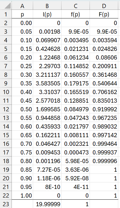 Column B shows the likelihood values for each of the p values in the grid. The corresponding pdf values are shown in column C and the cdf values in column D. E.g. cell B23 contains formula =SUM(B2:B22), cell C3 contains =B3/B$23, and D3 contains =C3+D2.