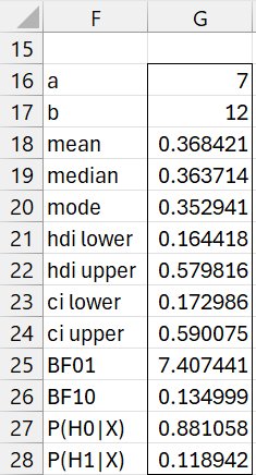 It turns out that data used in Figure 1 was derived from a beta distribution. In particular, cell B2 contains the formula =BETA.DIST(A2,7,12,FALSE), and range B2:B22 was highlighted and Ctrl-D was pressed. Thus, the grid represents a course characterization of a beta distribution with parameters alpha = 7 and beta = 12. As described in Bayesian Characterization of a Beta Distribution, we can use the array formula =BayesBeta(7,12,TRUE) to create the output shown in Figure 6.