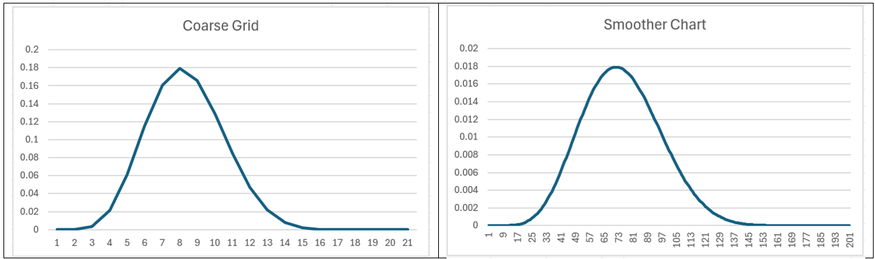 We now create a revised version of Figure 4 using the finer grid from Figure 7. This is done by using the array formula =GridDesc(R2:R202,U2:U202,TRUE,0.5). The output is shown in Figure 8.