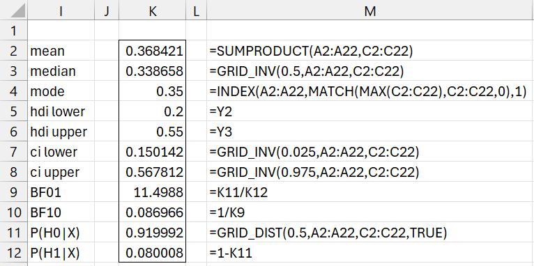 Note that the 95% HDI is calculated via the GRID_HDI function shown in Figure 5 (and cells K5 and K6 of Figure 4), as described in Credible Interval and HDI.