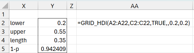 Note that we can’t simply use the default .1 value lprec and uprec arguments in =GRID_HDI(A2:A22,C2:C22,TRUE) since with only 21 data points, the no credible interval qualifies as an HDI. By broadening the tolerance from 10% to 20%, we obtain the interval described above. Note that obtained 1-p value of .942409 is too far away from .95 to qualify when lprec = uprec = .1. In fact, since .95 – .05*.1 = .945, 1-p would have to be between .945 and .955. By using lprec = uprec = .2, since .95 – .05*.2 = .94, the value in cell Y5 qualifies since it is between .94 and .96. In fact, even if we use lprec = .16, Y5 would still qualify since .95-.05*.16 = .942 < .942409.