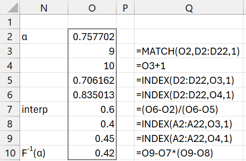 We can also use linear interpolation for the inverse function. E.g. F-1(T10) can be calculated as shown in Figure 3. The good news is that F-1(T10) = .42, as expected.