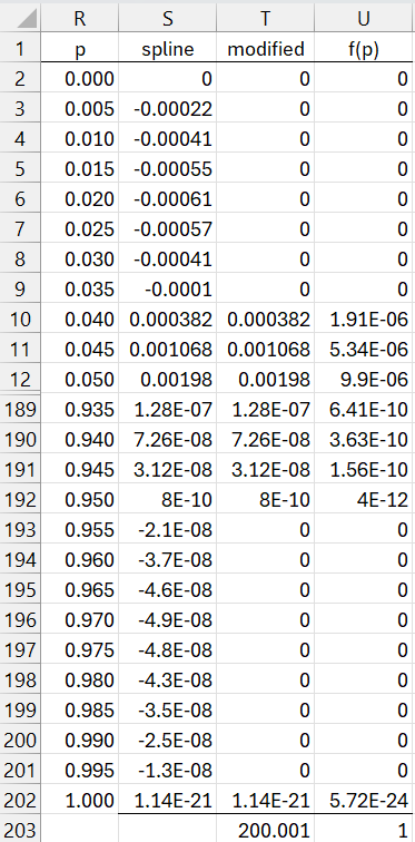 We see that many of the entries in Figure 4 are reasonable approximations of the corresponding entry in Figure 6. We can improve the accuracy by adding more data to that shown in Figure 1 by spline interpolation. This results in a grid with 201 entries instead of 21, as shown in Figure 7 (only the first and last few entries are displayed).