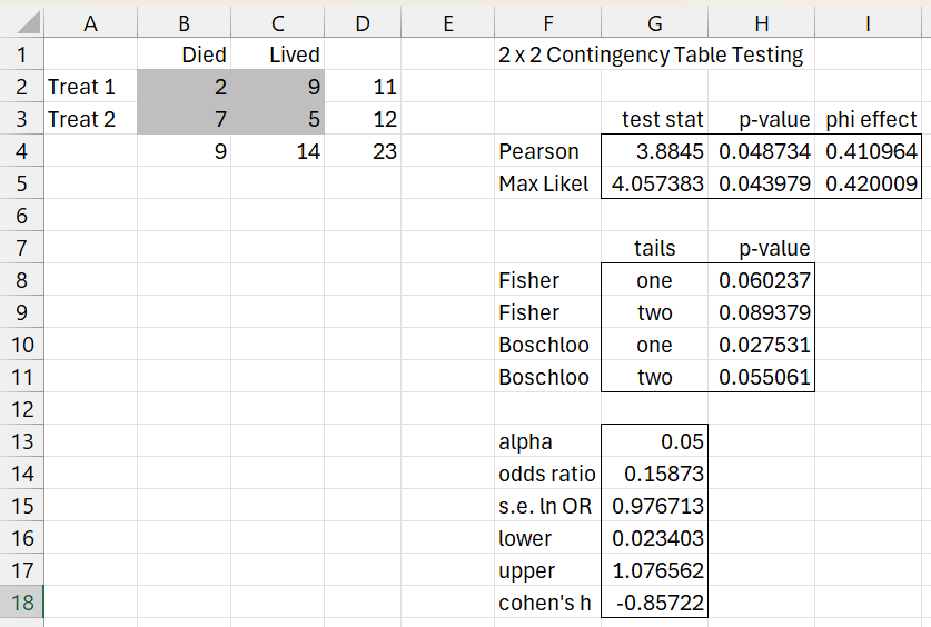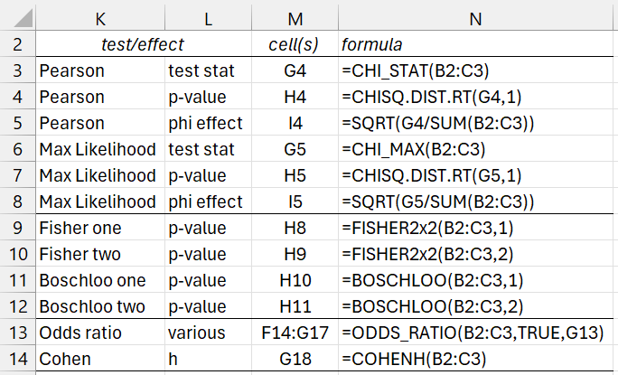 COHENH(R1) = Cohen’s h effect size for the 2 × 2 contingency table in R1.