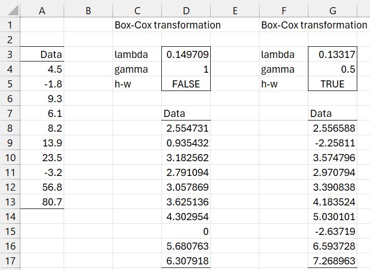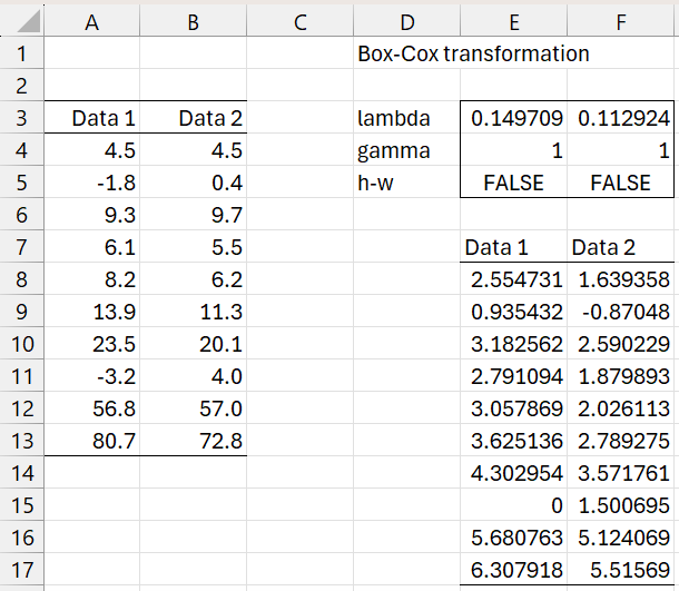 You can also calculate the Box-Cox transformed values directly. E.g. to calculate the value in cell D4, you first calculate the minimum data value of -3.2 using the formula =MIN(A4:A13). You then add 1-(-3.2) = 4.2 to the value in cell D4 to obtain 4.5 + 4.2 = 8.2. The resulting value shown in cell D4 is then (8.2 ^ .149709 – 1) / .149709 = 2.554731.