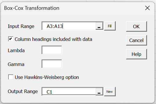 Since the Lambda and Gamma fields are left blank, the defaults are used. This means that gamma = 1 and lambda is set to the value that maximizes LL. Since the Hawkins-Weisberg option is unchecked, the original Box-Cox transformation is used.