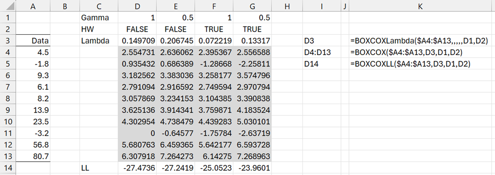BOXCOXLL(R1, λ, γ, hw) = log likelihood function of the Box-Cox transformation of the data in R1 using the given λ and γ values