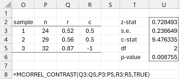 MCORREL_CONTRAST(Rr, Rn, Rc, lab): returns an array with the values: z,-stat, s.e., c-stat, df, p-value for the contrast analysis based on the k × 1 contrast array; note that c-stat is the C-sq test statistic.