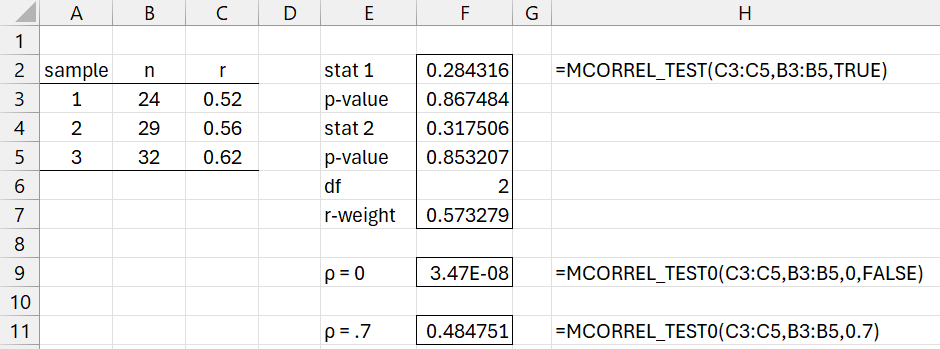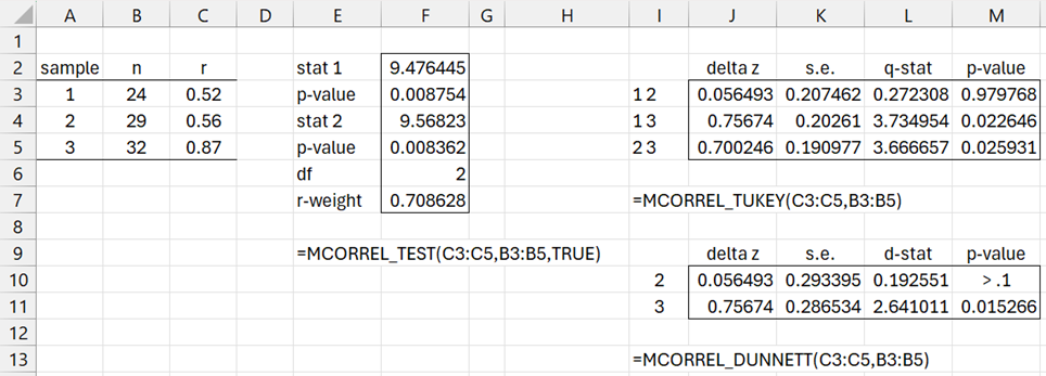 We now duplicate the results of the various examples shown in Correlation Testing for more than Two Samples using these worksheet functions.