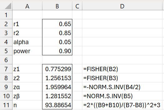 Note that if the fixed value is set too low, the formula will return a negative value, indicating that the specified level of power can’t be achieved. E.g. if n1 = 49 then n2 = 3758, but if n1 = 48 then n2 = -4610. This indicates that even with extremely large values of n2, power near .90 can be achieved but not .90 or greater.