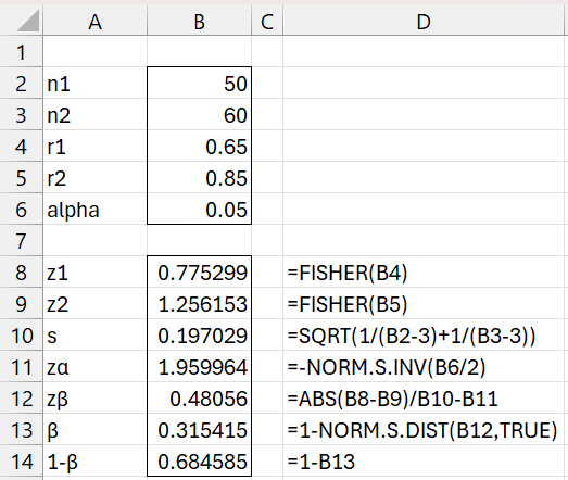 For Example 1, we can obtain the power shown in cell B14 using the formula =CORREL2_POWER(B4, B5, B2, B3, 2, B6).