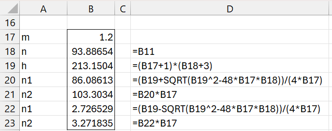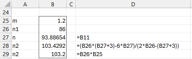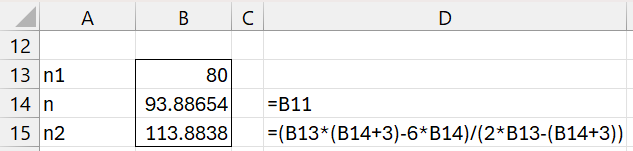 For Example 4, we see that n1 = 87 and n2 = 104, as shown in Figure 4. n1 < n < n2 as expected. We see that the values calculated using the negative of the square root don’t have this property and are rejected.