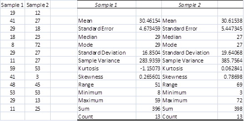 descriptive-statistics-data-analysis-tool Shows output from Excel’s Descriptive Statistics data analysis tool for more than one data set