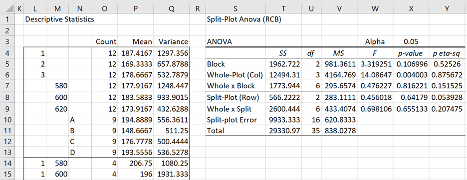 We choose the Excel format option using the RCB model for whole plots with 3 rows per replication. The data analysis tool first converts the data in Excel format into standard format (as shown in range G1:J34 of Figure 1), and then outputs the descriptive statistics and Anova shown in Figure 3. If the input data is already in standard format you would choose the Standard format with column headings or Standard format without column headings and obviously the conversion to standard format would not be necessary.