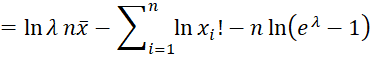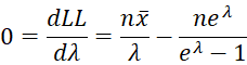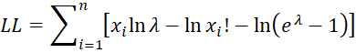 This is the same expression for the mean as shown in Zero-Truncated Poisson Distribution. Thus, the method of moments and the MLE fitting method produce the same result.