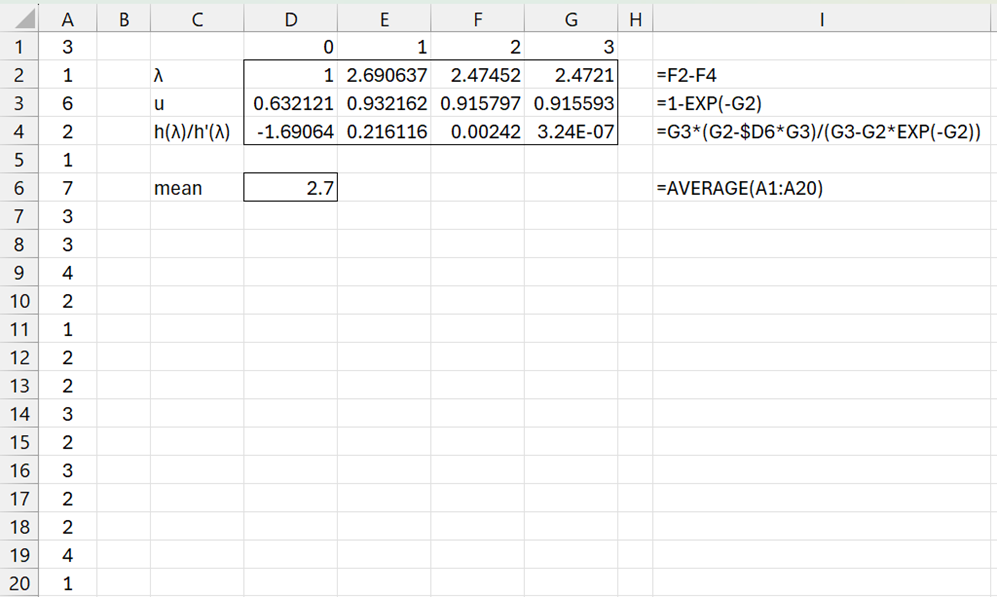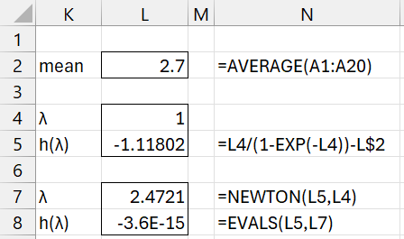 We arrive at the same estimate for lambda by using Real Statistics’ NEWTON worksheet function (see Root-finding Functions), as shown in cell L7 of Figure 2.