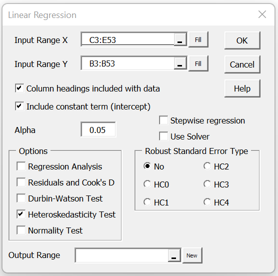 Real Statistics Data Analysis Tool: The Breusch-Pagan and White tests can be carried out using the Heteroskedasticity Test option of Real Statistics’ Multiple Linear Regression data analysis tool. We now show how this is done for the data in Example 1 of Breusch-Pagan Test.