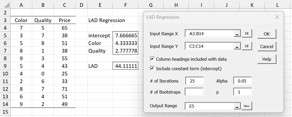The output is shown in columns E and F of Figure 1. Note that the values in range F5:F7 can be calculated using the array formula =LADRegCoeff(A4:B14,C4:C14), while the LAD value in cell F9 is calculated using the formula