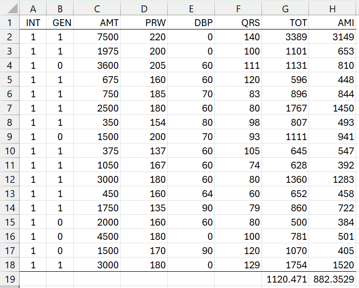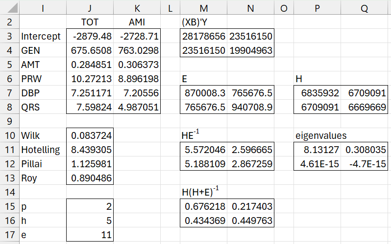 We have also included a column of ones for the intercept (A2:A18), and the means of the data for the two dependent variables, TOT and AMI (in G19:H19).