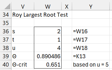 The table of critical values for Roy’s test doesn’t have an entry for less than u = 5. If we use u = 5 instead of u = 4, then Θ = .890486 > .651 = Θcrit, which rejects the null hypothesis. Actually, we can obtain this result by using the Real Statistics formula =RoyCRIT(2, 1, 4).
