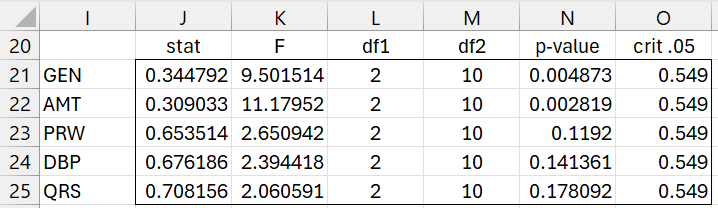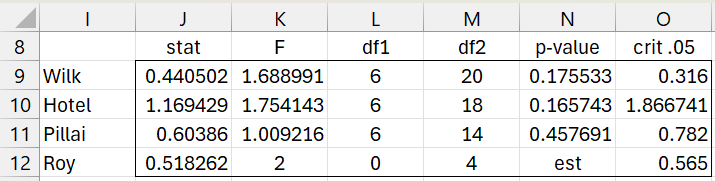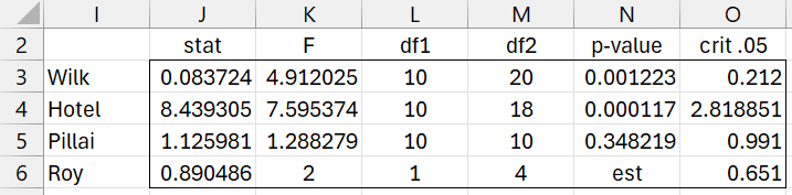 MRegSig(Rx, Ry, xhead): returns an array whose rows provide a significance test for each of the k variables in Rx based on the multivariate regression model for Rx and Ry. Each row contains the Wilk statistic, F-stat, df1, df2, p-value, and .05 critical value for one of the variables in Rx. xhead is optional 1 × k array. If included, it provides the names of the variables in Rx and these are used to provide row headings in the output (in this case, column headings are also included in the output).