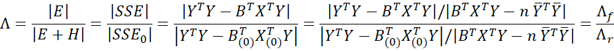 where Λf is the test statistic that the overall regression is significant (as described in Multivariate Regression Hypothesis Testing) and Λr is statistic for the same test but with the model based only on the first the first k-q columns of data.